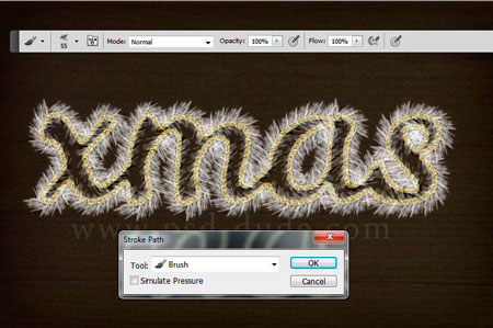 Создайте новый слой (Ctrl + Shift + N) и назовите его “Мишура”. Зажмите CTRL и кликните на миниатюре слоя с текстом, чтобы создать выделение. Сделайте щелчок правой кнопкой мыши по слою с текстом и выберите Создать рабочий контур (Create Work Path), выберите Кисть (Brush) блестки, которую Вы найдете в ZIP архиве в конце урока. Выберите белый цвет для кисти и затем снова делаем щелчок правой кнопкой мыши по слою и выберите Выполнить обводку (Stroke Path).
