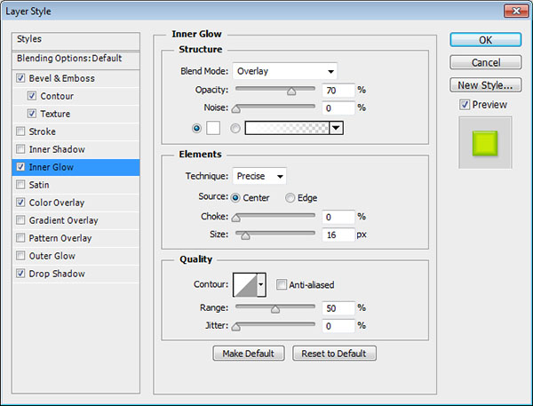 Внутреннее свечение (Inner Glow): Режим – Перекрытие, Метод – Точный.