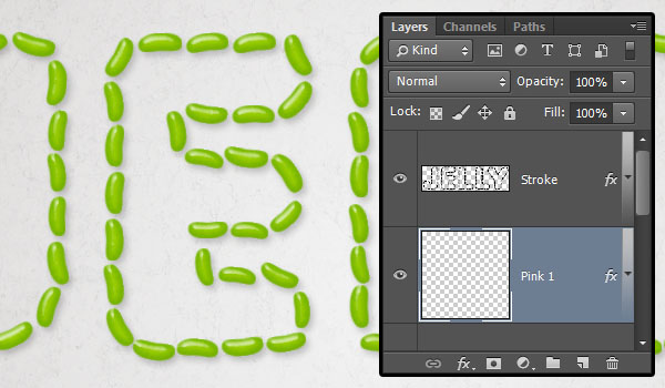 Создайте новый слой под слоем «Stroke» и назовите его «Pink 1». На этом слое мы будем заполнять текст розовыми бобами. Название слоя поможет не запутаться в большом количестве разноцветных бобов. К каждому слою с бобами вставляйте стили, которые мы скопировали со слоя «Stroke».
