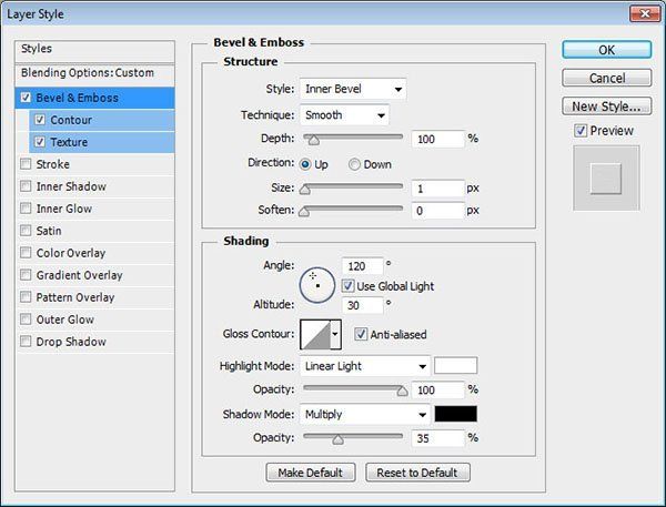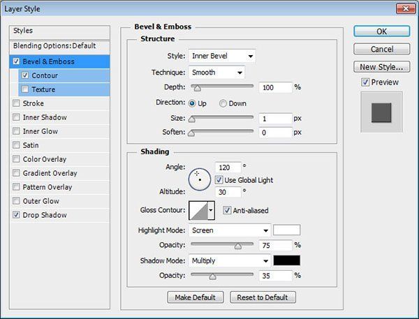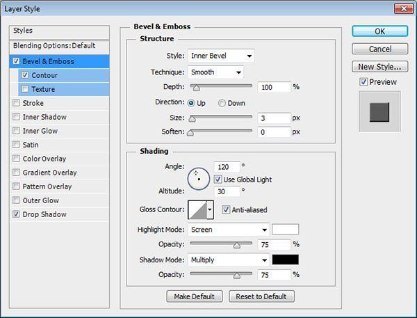 Дважды кликните на оригинальный слой с формой (тот, что над слоем Тень текста) и примените такие стили.