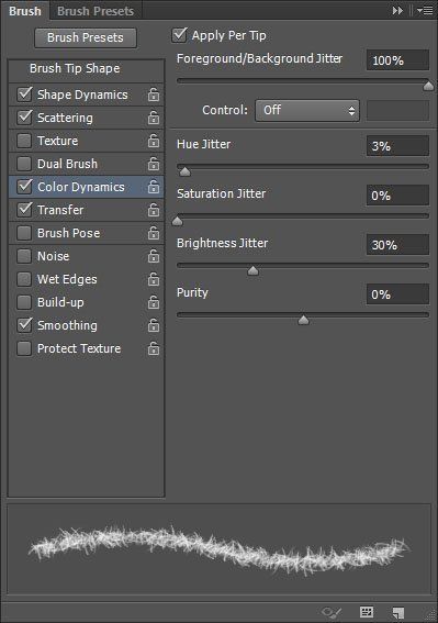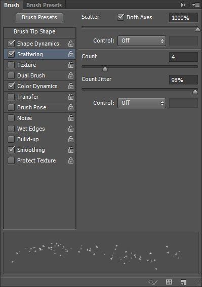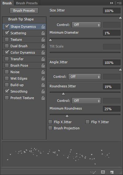 (Brush Tool), откройте панель кистей (Brush panel), выберите кисть №112 и установите настройки как показано на рисунке.