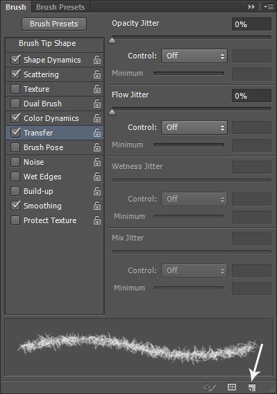После того как вы закончили с настройками, кликните на иконку Новая кисть (Create new brush) на панели кистей и введите имя новой настройки. Это поможет нам в дальнейшем.