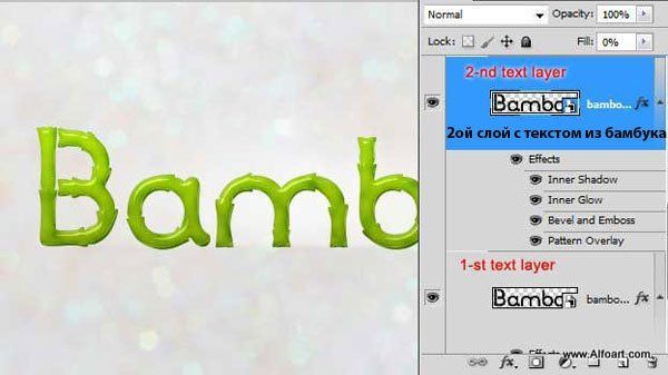 Продублируйте слой 1й слой с текстом из бамбука, для дубликата слоя, установите значение Заливки (Fill) = 0%, а также примените следующие стили слоя: