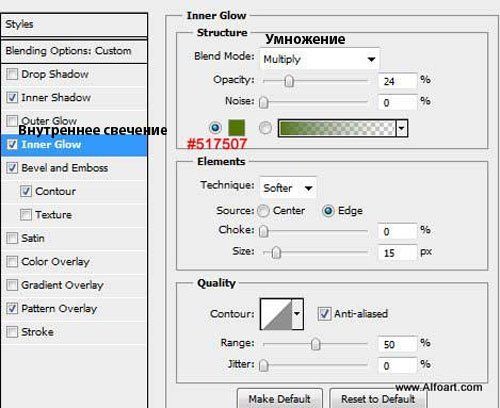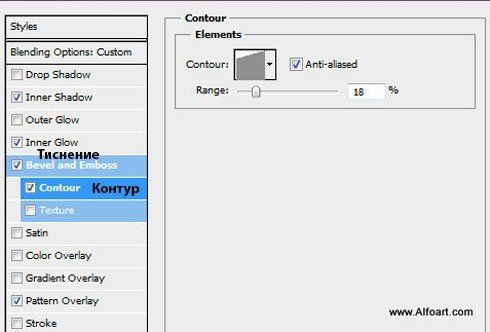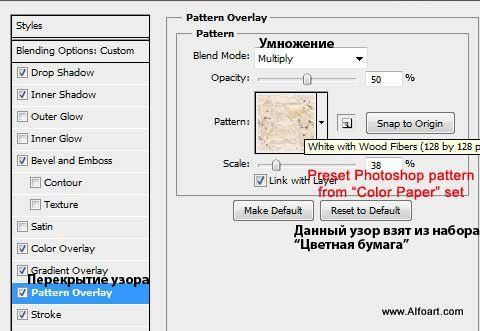 Примечание переводчика: для опции Перекрытие узора, если у вас нет данного узора, вы можете подобрать похожий узор, например волокна дерева или попробуйте использовать текстуру мрамора.