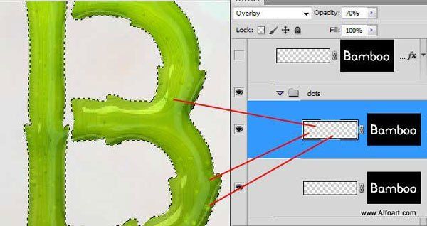 Ещё раз создайте новый слой, не снимайте активного выделения с текста. Прокрасьте участки между секциями стеблей бамбука с помощью кисти маленького диаметра. Данные участки между секциями бамбука не должны иметь гладкий, либо острый контур. Используйте любой цветовой оттенок.