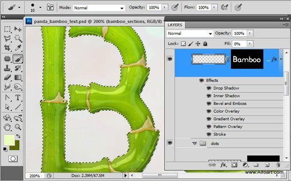 Объедините слой с контуром стеблей бамбука и слой с текстом. Вы получите 1й слой с текстом из бамбука. К данному слою, примените стили слоя Наложение Градиента (Gradient Overlay) и Тиснение (Bevel and Emboss).