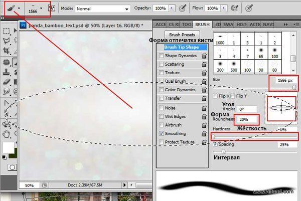 Создайте новый слой поверх слоя с текстом. Выберите кисть небольшого размера, нарисуйте контур, напоминающий стебли бамбука. Проделайте это с каждой секцией текста.