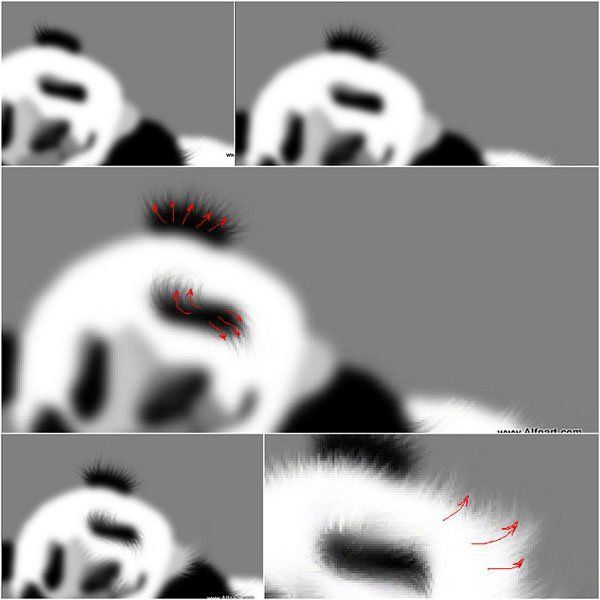 (Smudge Tool), установив кисть волосы. Установите значение Интенсивности (strength) для инструмента палец 70%. Движение инструмента должно идти с внутренней стороны к внешней кромке изображения панды. Попробуйте варьировать размер кисти, чтобы подобрать наилучший вариант для различных участков изображения панды.