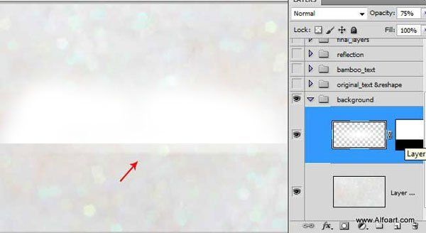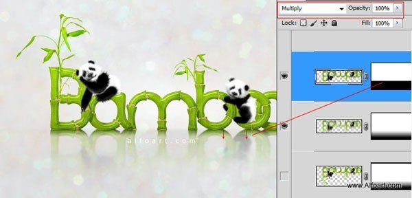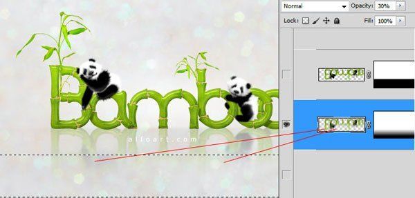 Сместите совмещённый слой вниз, чтобы создать отражение. Расположите данный слой ниже слоя с группой с пандами и текстом, но поверх слоя с задним фоном и белым пятном.