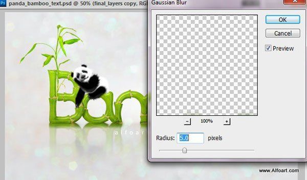 К слою с пандой, примените фильтр Размытие по Гауссу (Gaussian Blur), радиус размытия 3-5px. Задний фон должен быть прозрачным.
