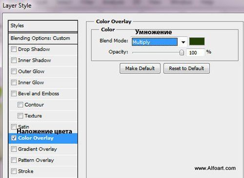 К данному слою добавьте стили слоя Наложение цвета (color overlay), цвет наложения тёмно-зелёный.