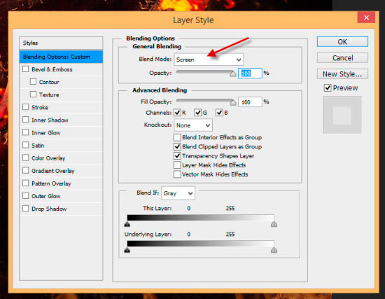 Установите Режим наложения (Blending Mode) слоя с огнем на Экран (Screen):