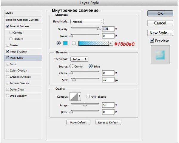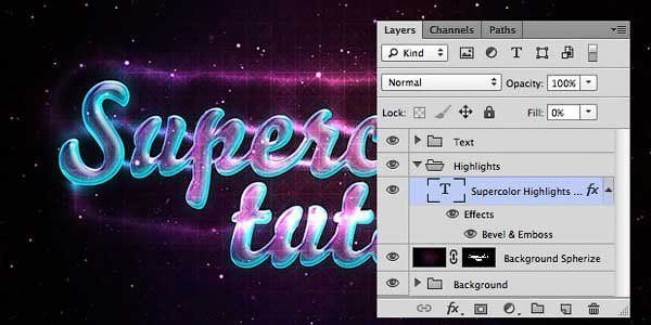 Дублируйте оригинальный слой с текстом (Ctrl+J). Поместите этот слой в группу Highlights (Ctrl+G). Эта группа должна располагаться под группой Text. Добавьте к этому тексту стиль слоя с параметрами, показанными ниже. Установите Fill (Заливка) на 0%.