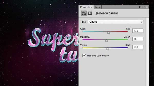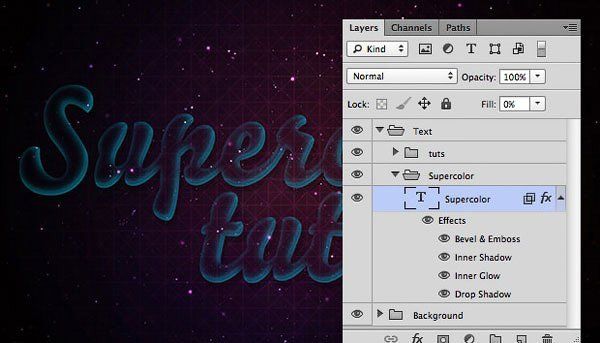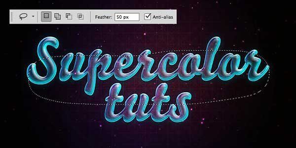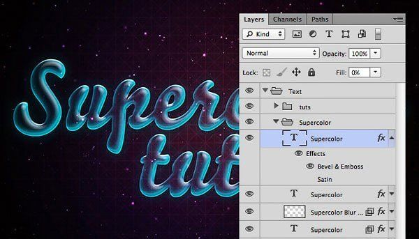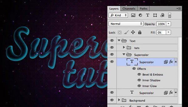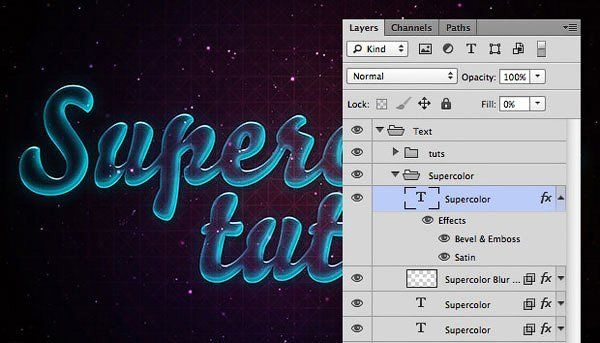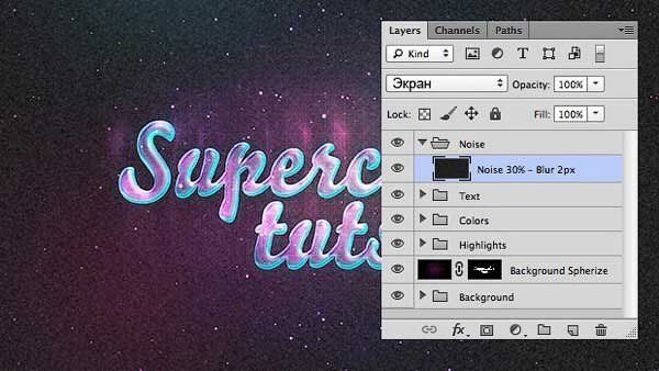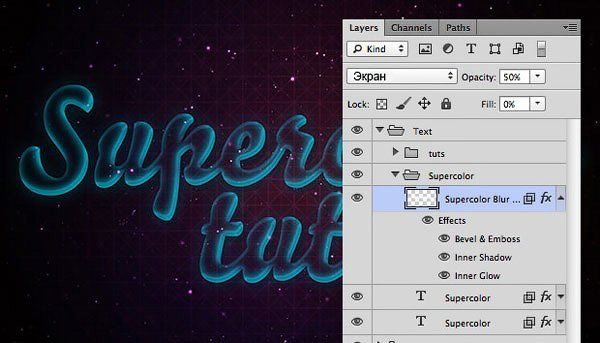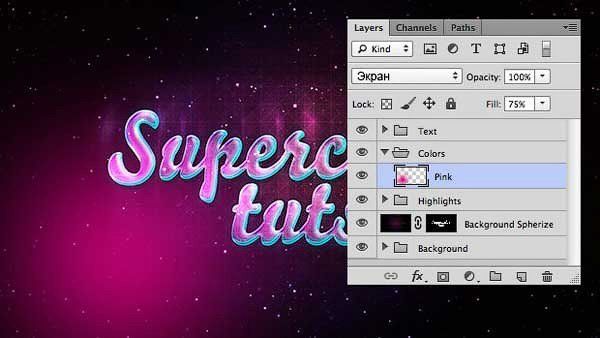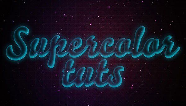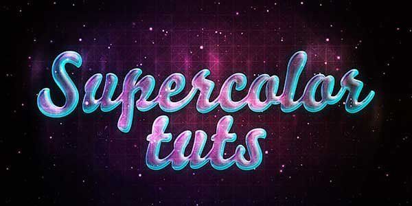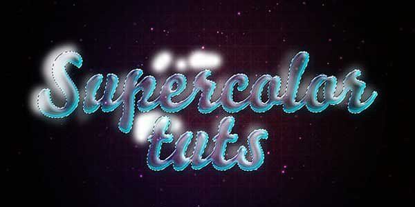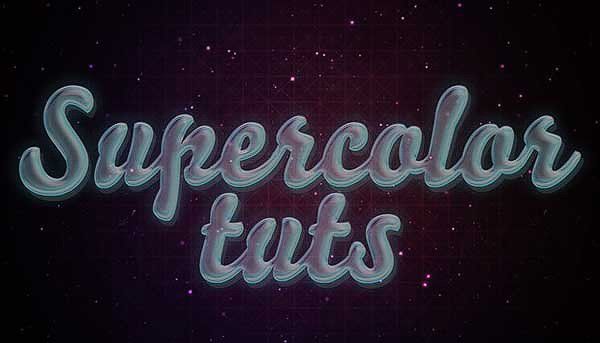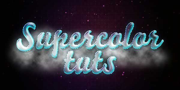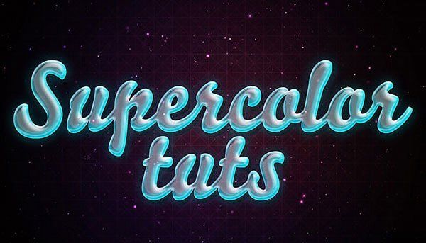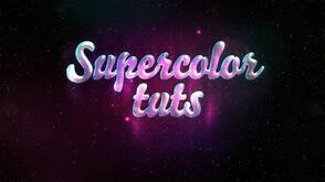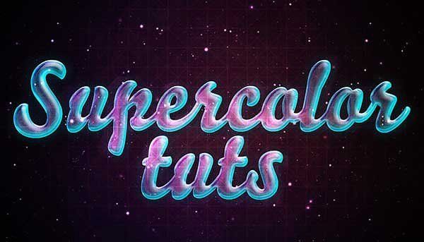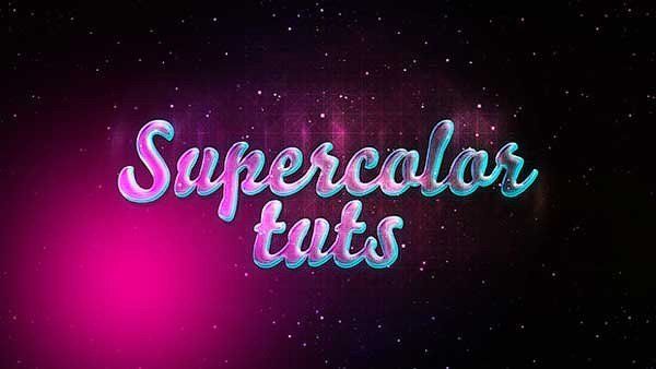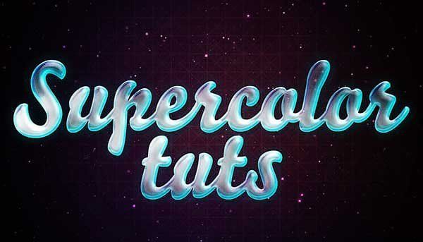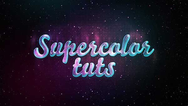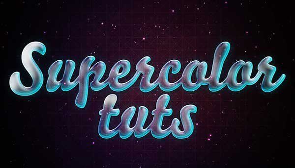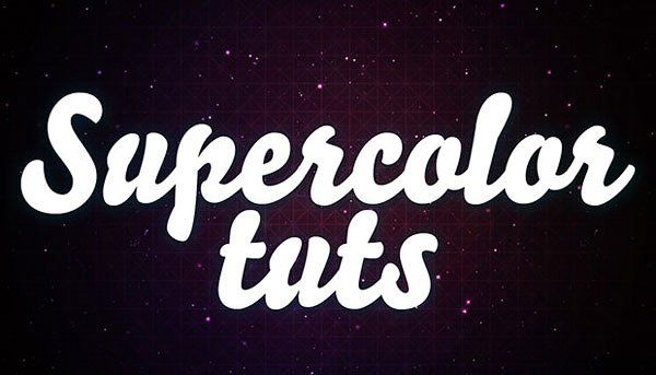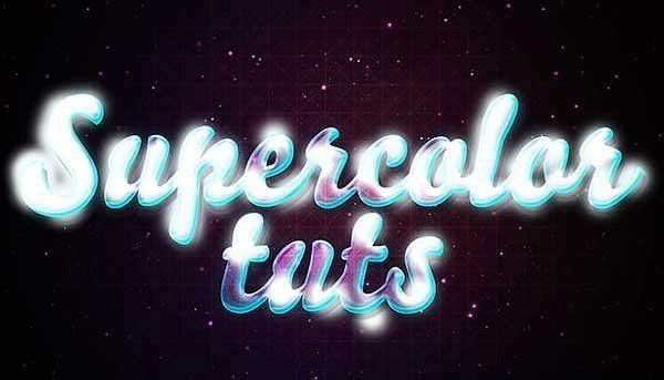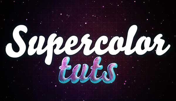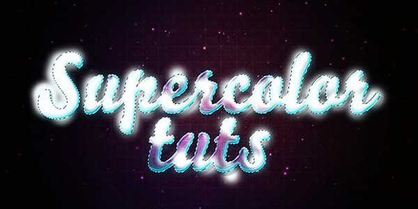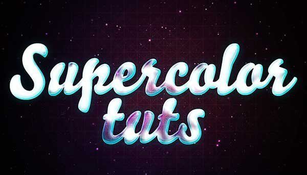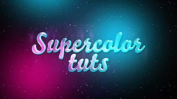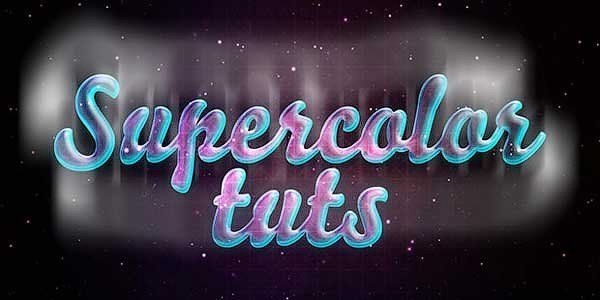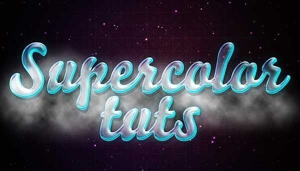 Итак, наш фон готов. Теперь займёмся созданием текста с множеством цветов и бликов. Выберите шрифт и напишите слово или фразу белым цветом. В данном уроке я использовал шрифт Bello и написал в центре “Supercolor”, а ниже Tuts”.