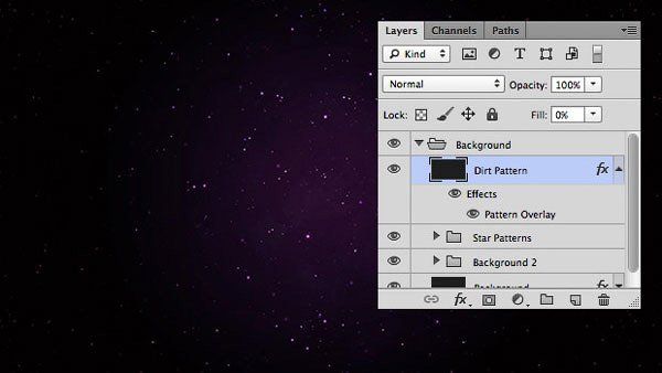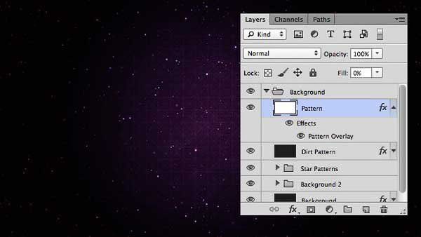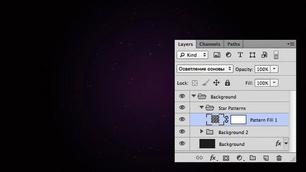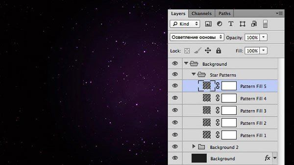 Поместите этот слой в группу (Ctrl+G) и переименуйте её в Star Patterns. Внутри этой группы создайте ещё 3 – 4 слоя – заливки, используя другие узоры набора. Изменяйте Scale (Масштаб) узоров, а так же для всех слоёв установите режим наложения на Color Dodge (Осветление основы).