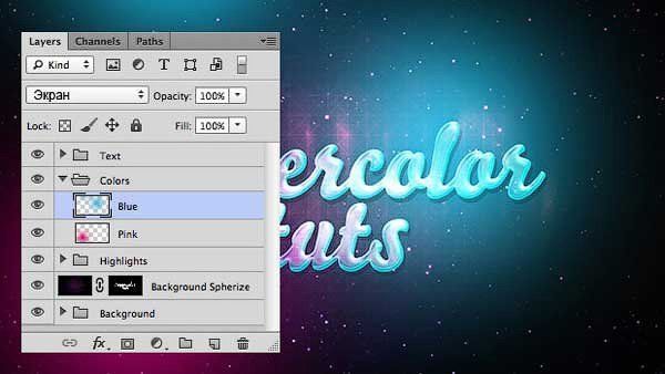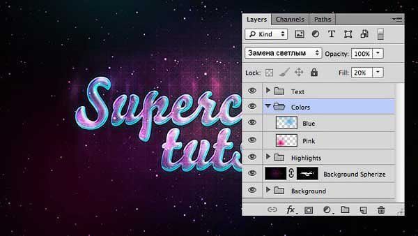 Создайте новый слой (Shift+Ctrl+N) и нарисуйте ещё пятна другим цветом. Я немного размыл слои с цветными пятнами, вы так же можете их размыть. Измените режим наложения слоя на Screen (Экран). Поместите оба слоя в группу Colors (Ctrl+G) и поместите её под группу Text. Измените режим наложения группы на Lighten (Замена светлым) и установите Fill (Заливка) на 20%.