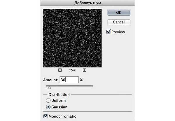 Давайте добавим немного шума для нашего эффекта. Выше всех слоёв создайте новый слой (Shift+Ctrl+N) и залейте чёрным цветом. К этому слою примените фильтр, пройдя в Filter > Noise > Add Noise (Фильтр – Шум – Добавить шум) со следующими настройками: Amount (Эффект) 30% и Gaussian for the Distribution (Распределение по Гауссу).