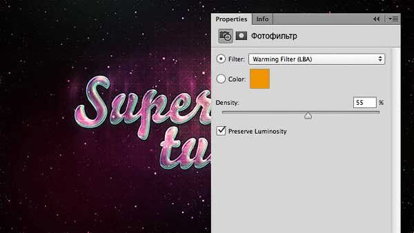 В заключение урока добавим два корректирующих слоя. Первый корректирующий слой – Photo Filter (Фотофильтр). Пройдите в Layer > New Adjustment Layer > Photo Filter (Слой – Новый Корректирующий слой – Фотофильтр) и установите настройки, показанные ниже.