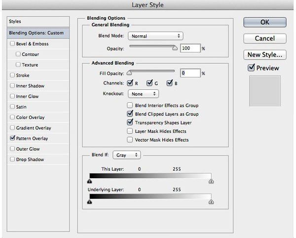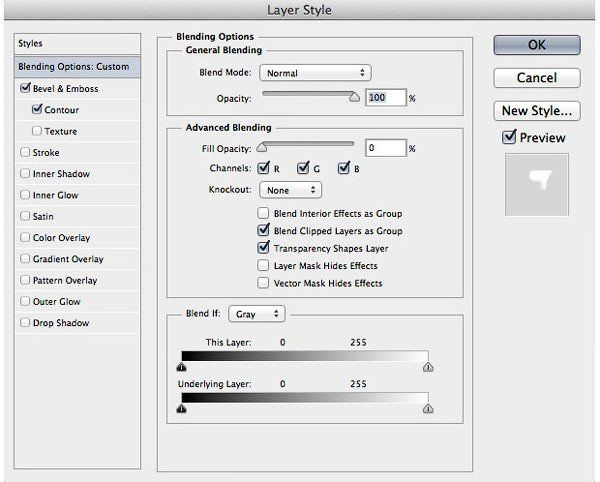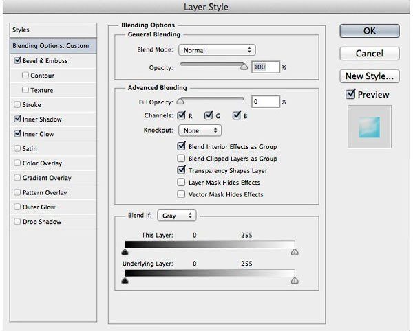 Примечание переводчика: в окне Blending Options (Параметры наложения) во вкладке Advanced Blending (Дополнительные параметры) обращайте внимание на расстановку галочек. Иначе вы не получите желаемый эффект.