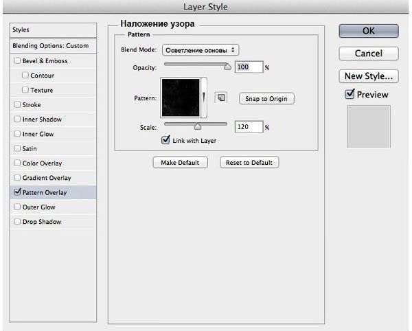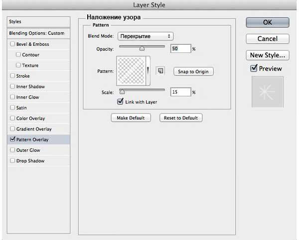 Вернитесь в рабочий документ. Создайте новый слой (Shift+Ctrl+N) и залейте его белым цветом – Edit > Fill > White (Редактирование – Выполнить заливку – Белый). К этому слою примените стиль слоя Pattern Overlay (Наложение узора) с параметрами, показанными ниже. Выберите тот узор, который только что создали. Убедитесь, что параметр Fill (Заливка) слоя установлен на 0%, а режим наложения стиля на Overlay (Перекрытие).