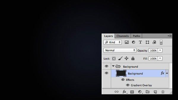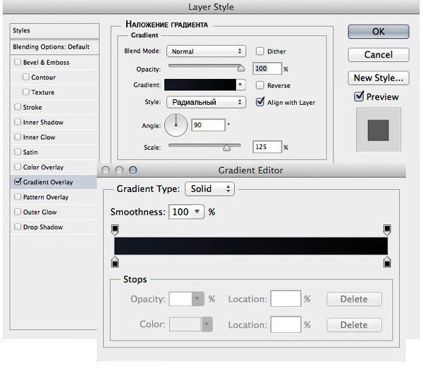Для этого слоя добавьте стиль слоя Gradient Overlay (Наложение градиента) с параметрами, показанными ниже. Цвета градиента от #161626 к #010101.