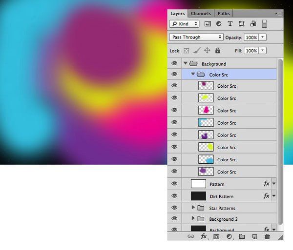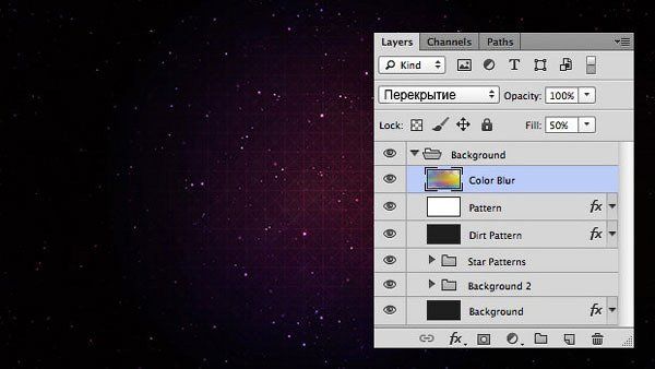 Измените режим наложения этого слоя на Overlay (Перекрытие), установите Fill (Заливка) на 50% и переименуйте в Color Blur. Поместите все слои, которые вы создали с самого начала, в группу Background.