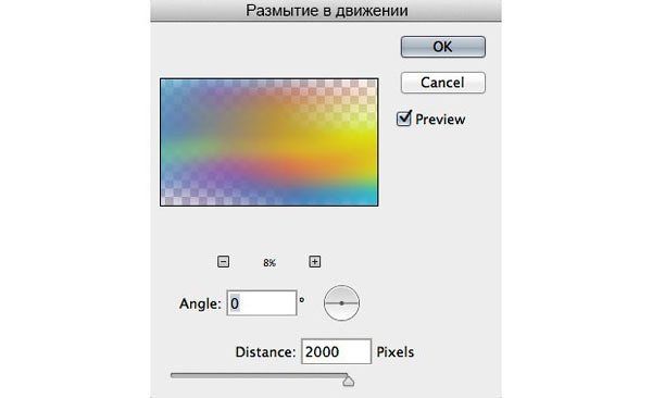 Объедините все слои с цветовыми пятнами в один слой. Для этого в панели слоёв выделите все цветные слои, щёлкните правой кнопкой мыши и выберите Merge Layers (Объединить слои) или Ctrl+E. К этому объединённому слою примените фильтр Filter > Blur > Motion Blur (Фильтр – Размытие – Размытие в движении) со следующими параметрами: Angle(угол) 0°, Distance (Смещение) 2000 px.