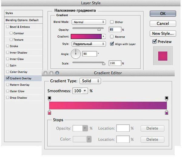 Создайте новый слой (Shift+Ctrl+N) и залейте белым, пройдя в Edit > Fill > White (Редактирование – Выполнить заливку – Белый). Добавьте стиль слоя Gradient Overlay (Наложение градиента) с параметрами, показанными ниже. Цвета градиента от #E93080 к #902985.