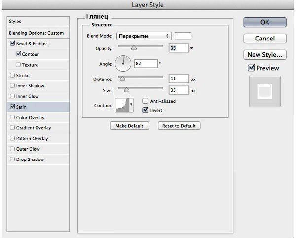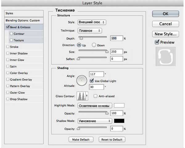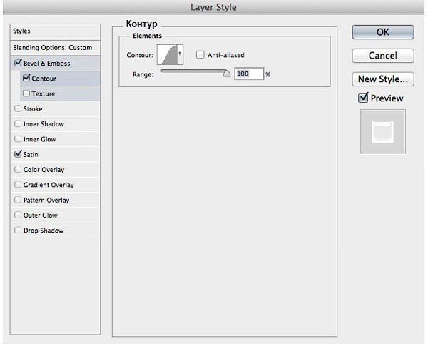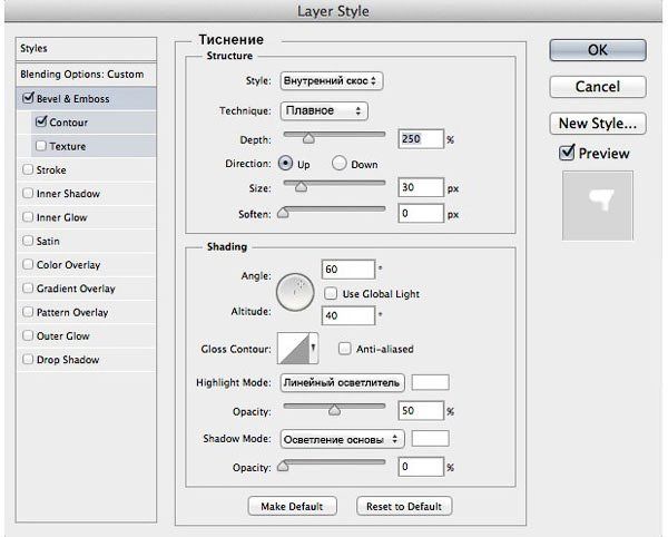 Примечание переводчика: в стиле Тиснение данного контура в наборе Фотошопа нет. Создайте его самостоятельно. Для этого нажмите на окно контура, откроется окно редактора. Установите для левой точки - (вход) 0, output (выход) 100, для средней – 50, 50 и для правой – 100, 100.