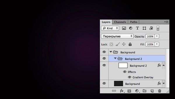 Поместите этот слой в новую группу (Ctrl+G). Измените режим наложения группы на Overlay (Перекрытие) и переименуйте слой и группу в Background 2.