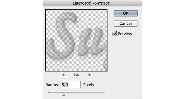 На первой копии примените фильтр, пройдя в Filter > Other > High Pass (Фильтр – Другое – Цветовой контраст), Radius (радиус) 5 px. Измените режим наложения слоя на Overlay (Перекрытие).