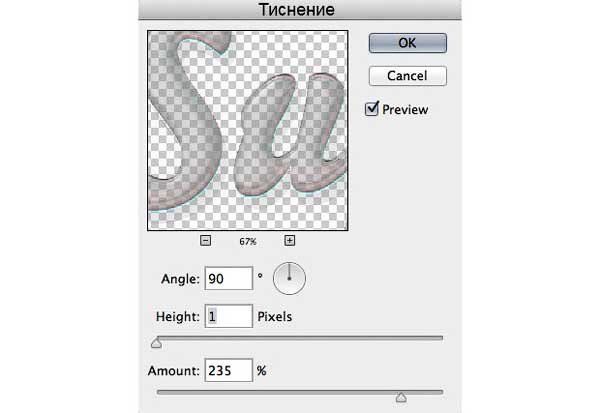 Выберите третью копию и примените фильтр, пройдя в Filter > Stylize > Emboss (Фильтр – Стилизация – Тиснение) Angle (Угол) 90°, Height (Высота) 1 рх, Amount (Эффект) 235%. Измените режим наложения слоя на Overlay (Перекрытие).