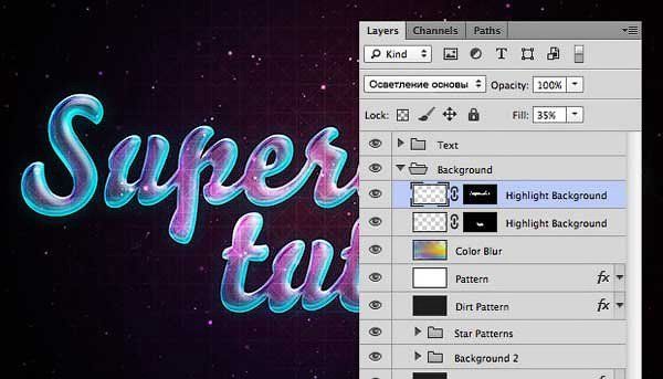 Загрузите выделение текста уже известным вам способом и добавьте маску слоя – Layer > Layer Mask > Reveal Selection (Слой – Слой – маска – Показать выделенную область). Измените режим наложения слоя на Color Dodge (Осветление основы) и установите Fill (Заливка) на 35%. Поместите этот слой в группу Background выше всех слоёв.