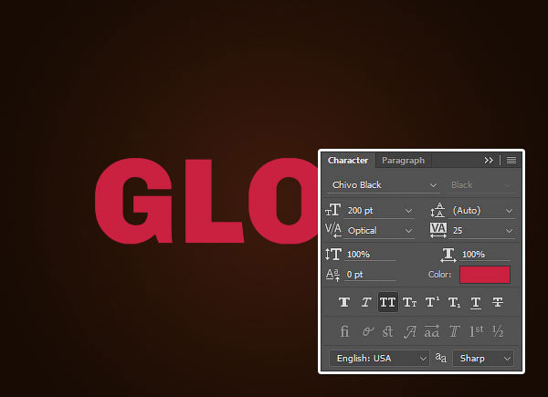 Напечатайте текст заглавными буквами, используя шрифт Chivo Black. Цвет шрифта #cb2141, размер шрифта 200 pt, значение Трекинга (Tracking) 25.