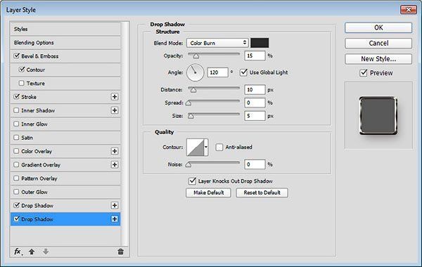 Добавьте ещё один стиль слоя Тень (Drop Shadow). Установите следующие настройки для данного стиля слоя: