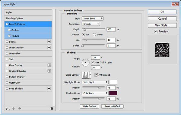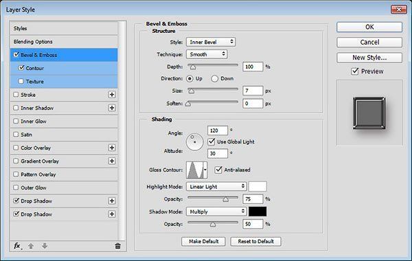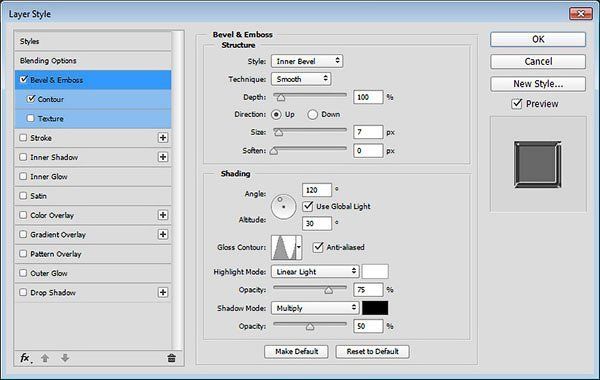 Добавьте стиль слоя Тиснение (Bevel and Emboss). Установите следующие настройки для данного стиля: