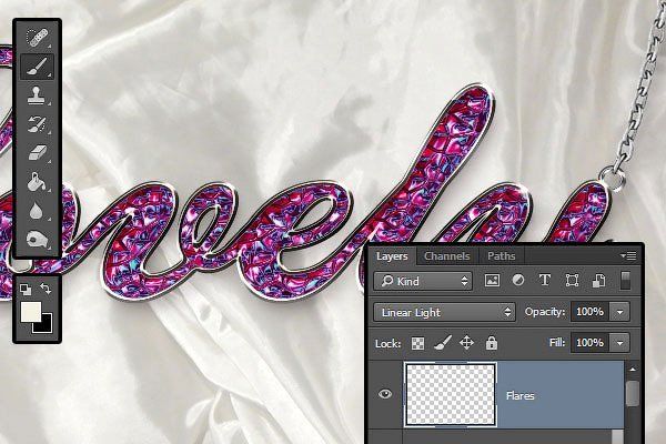 Создайте новый слой поверх всех остальных слоёв. Назовите этот слой Блики (Flares), поменяйте режим наложения для данного слоя на Линейный свет (Linear Light).