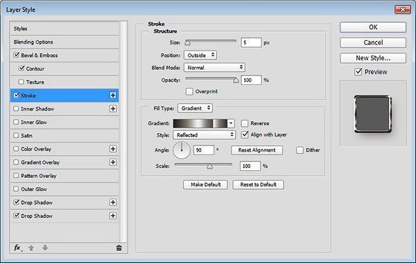 Далее, выберите следующий стиль слоя Обводка (Stroke). Установите следующие настройки для данного стиля слоя: