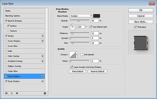 Далее, выберите следующий стиль слоя Тень (Drop Shadow). Установите следующие настройки для данного стиля слоя: