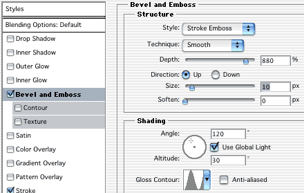 Далее выбираем Styles > Bevel and Emboss (Стили слоя > Тиснение) и устанавливаем такие параметры.