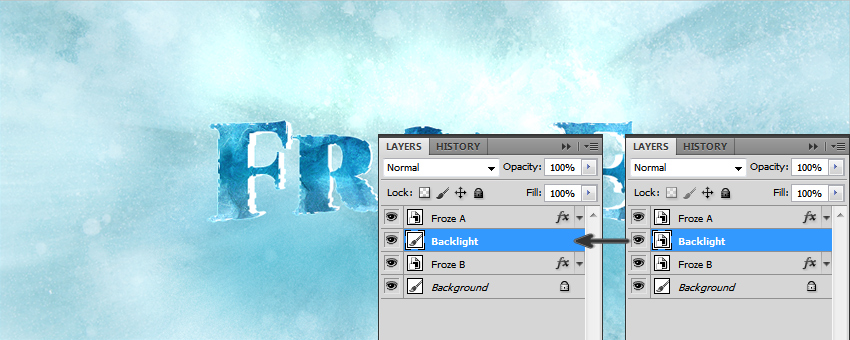 Отключаем видимость слоя «Froze A» и 8 раз дублируем слой «Froze B». С помощью этих копий мы создадим 3D-эффект.