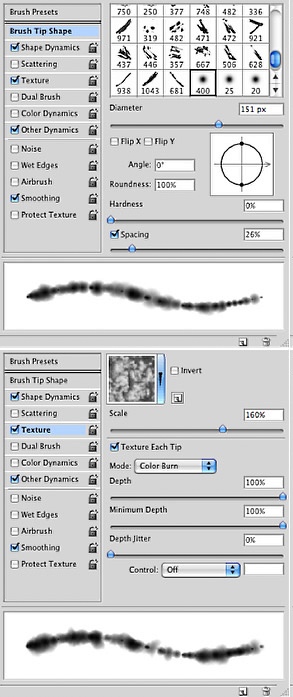 Шаг 5. Зайдите в меню Window – Brushes (Окно – Кисти). У Вас появится новое окно Brushes. Откройте его и настройте кисть примерно таким образом: