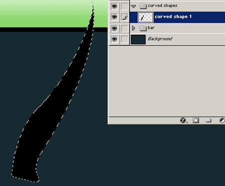 Шаг 10. Дублируйте только что созданный слой с кривой формой черного цвета. Загрузите выделение зеленого прямоугольника, и, наложите их на зеленый прямоугольник.