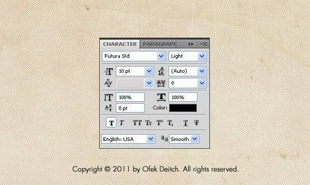 Создайте новый слой и напишите "Copyright © 2011 by Ofek Deitch. All rights reserved.". Настройки шрифта показаны ниже.