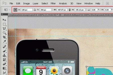 Все остальные группы и слои (кроме фонового) объедините в группу и назовите её “iPhone”. Перетащите эту группу в основной документ и измените размер на 348х680 пикселей. Расположите его, используя левые направляющие, как показано ниже.