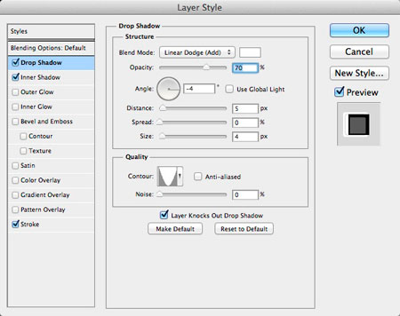 Layer> Layer Styles> Drop Shadow (Слой> Стиль Слоя> Тень). Используйте белый цвет, Режим наложения - Линейный осветлитель, Непрозрачность - 70%, угол – -4 градуса, Смещение - 5 пикс., Размер - 4 пикс. Контур выберите, как на изображении ниже.