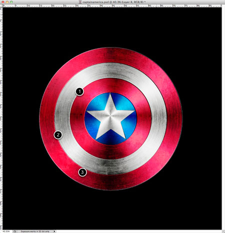 Примечание: автор не указал, однако можно предположить, что перед применением стилей слоя у вас должно остаться 5 слоёв (от края к центру): красный, серый, красный, синий, звезда.