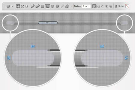 (Rounded Rectangle Tool) и проверьте, что радиус установлен на 5пикс. Создайте две фигуры, 30 на 12 пикселей и разместите их, как показано на следующем скриншоте. Опять же, Привязка к сетке облегчит вашу работу.