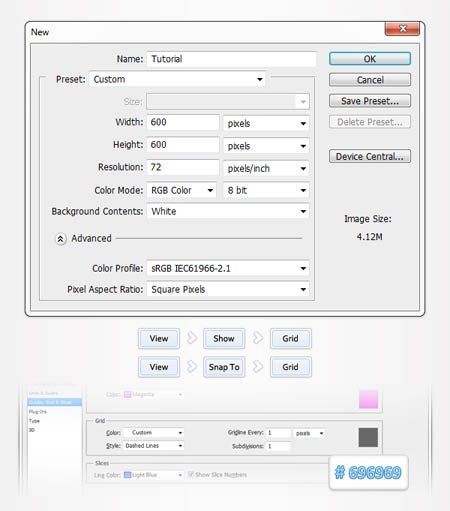 Откройте Photoshop и нажмите Ctrl + N для создания нового документа. Введите все данные, показанные на скриншоте ниже, и нажмите кнопку OK. Включите сетку в меню Просмотр – Показать - Сетку (View > Show > Grid) и привязку к сетке в меню Просмотр – Привязать к – Линиям сетки (View> Snap To Grid>). Теперь настроим интервалы сетки в 1 пикс. в меню Редактирование – Установки – Направляющие, сетка и фрагменты (Edit > Preferences > Guides, Grid & Slices), настройки ниже на скриншоте. Кроме того, установите цвет сетки на # 696969. После того как вы ввели все указанные настройки, жмите ОК. Теперь на вашем документе будет видна сетка, но не расстраивайтесь, она вам поможет в дальнейшей работе. Вам также необходимо открыть палитру информации в меню Окно – Инфо (Window> Info) для предварительного просмотра размеров и положения ваших фигур.