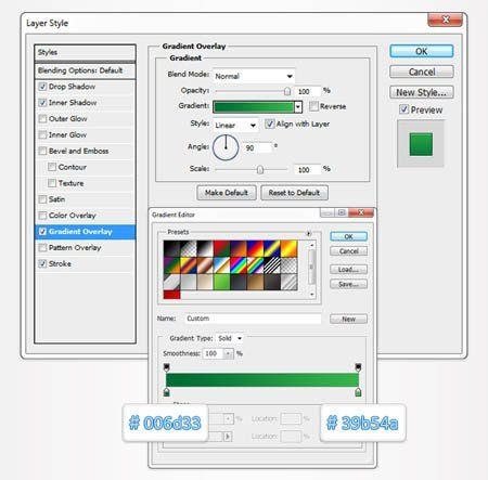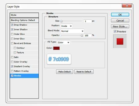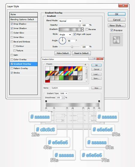 Дважды щёлкните на слое с левым прямоугольником и примените стили слоя: Тень (Drop Shadow), Внутренняя тень (Inner Shadow), Наложение градиента (Gradient Overlay) и Обводка (Stroke). Настройки смотрите ниже на скриншотах. Затем, для упрощения, сделаем маленький фокус. Скопируйте стили слоя с этого прямоугольника, нажав правой кнопкой мыши и выбрав опцию Скопировать стиль слоя (Copy Layer Style). Теперь сделайте активным слой с правым прямоугольником, нажмите правой кнопкой мыши и выберите опцию Вклеить стиль слоя (Paste Layers Style). Далее, выделите эти два скругленных прямоугольника в палитре слоёв и перетащите ниже основной фигуры, которую создали в третьем шаге.